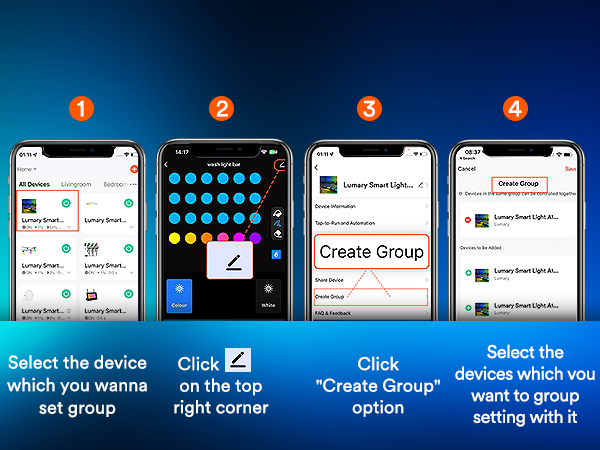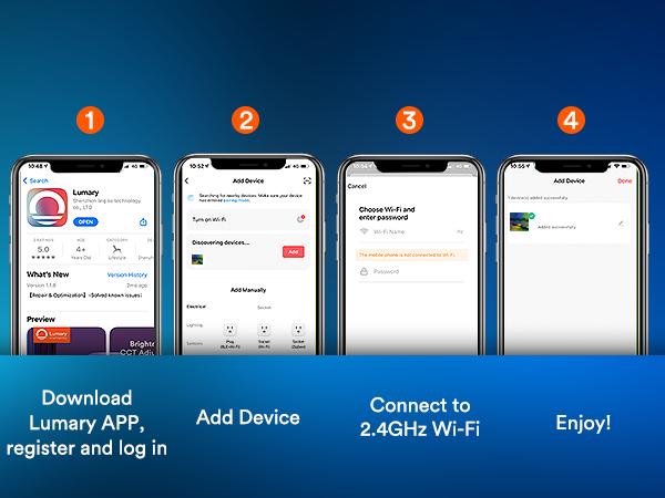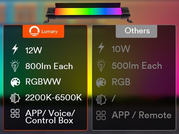 Multiple Control Methods: Control via Lumary app (2.4G Wi-Fi), voice (Alexa, Google Assistant, Siri), or control box. Adjust brightness, color temperature, and create scenes remotely.