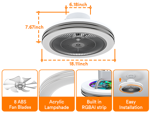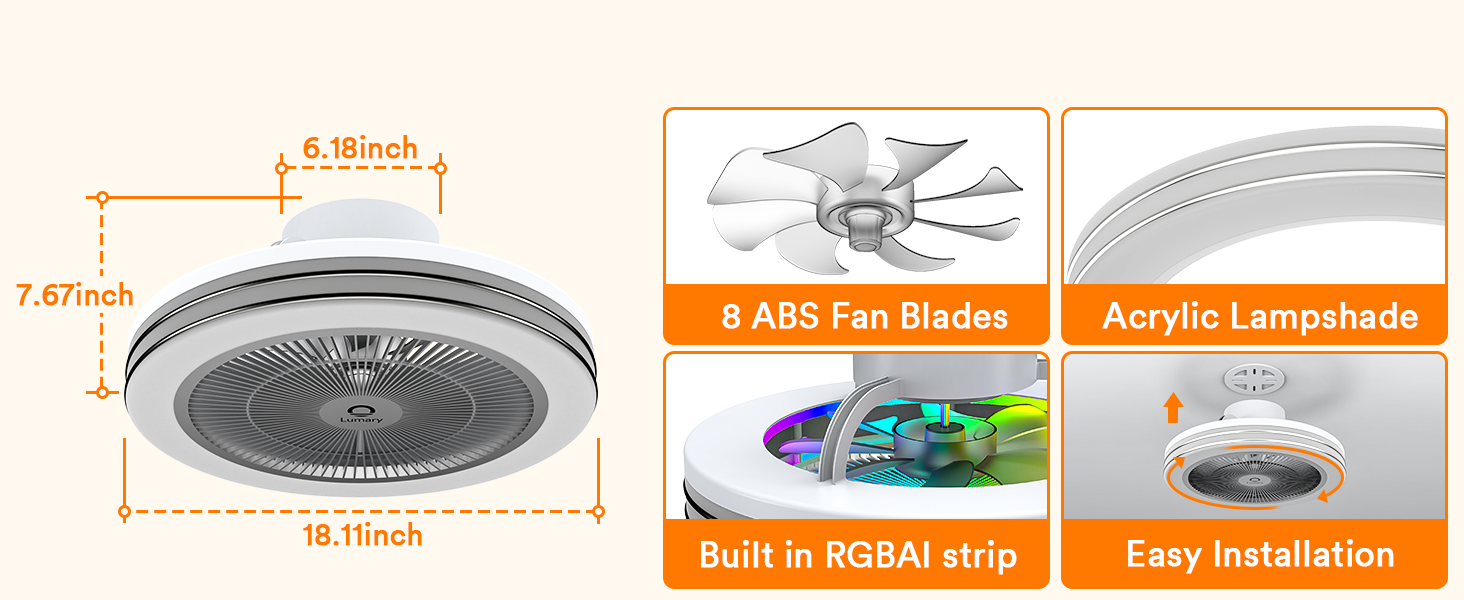 2-in-1 Design: The Lumary smart ceiling fan with LED light features a low-profile, enclosed design, perfect for rooms with low ceilings. The light and fan can be used together or separately for added convenience. Measuring 18 inches in diameter and 7.6 inches tall, it's compact and efficient.