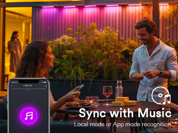 Music Sync: Lights change with music rhythm when activated in the app.
