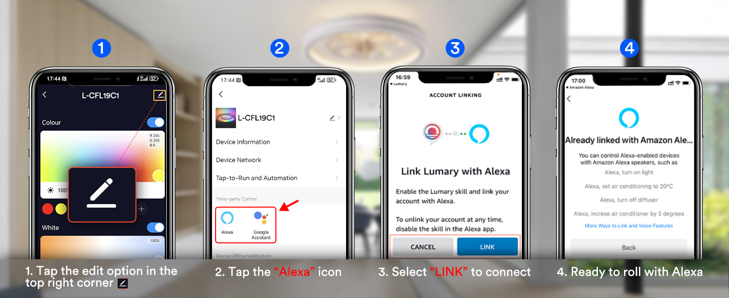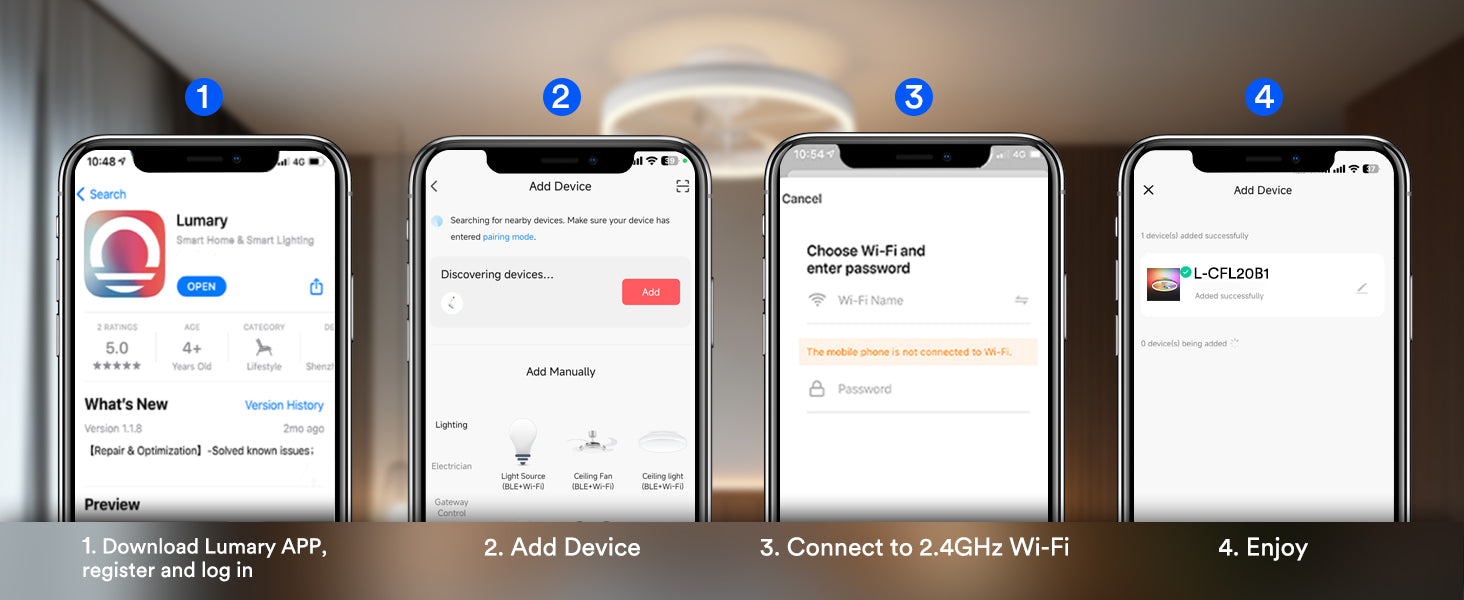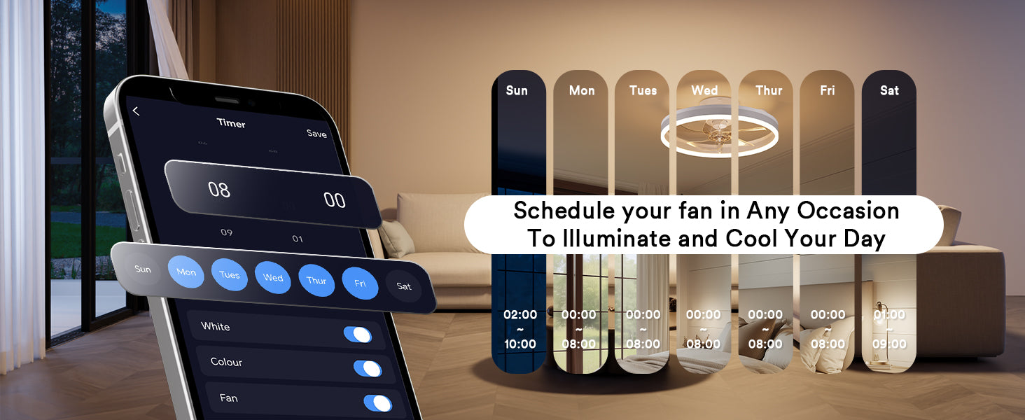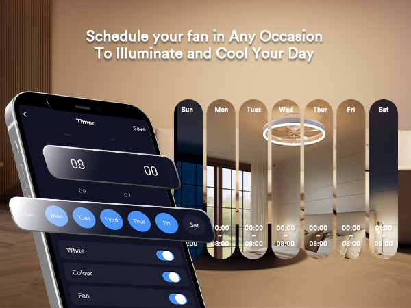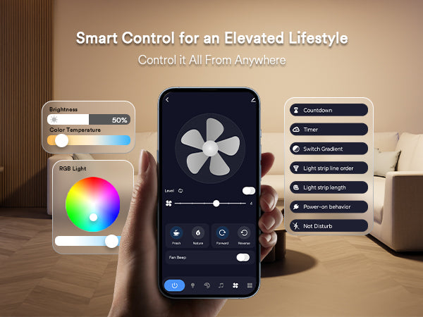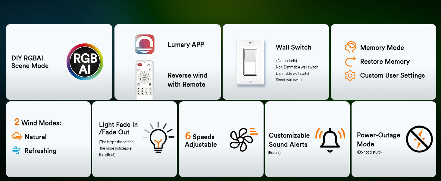 Smart WiFi Control:Control your Lumary ceiling fan with Alexa, Google Home, the Lumary App, or the included Bluetooth remote. Change fan speeds, adjust lighting colors, or set schedules—all with simple voice commands or a tap on your phone. (Note: Supports 2.4 GHz Wi-Fi only, not compatible with dimmer switches.)
