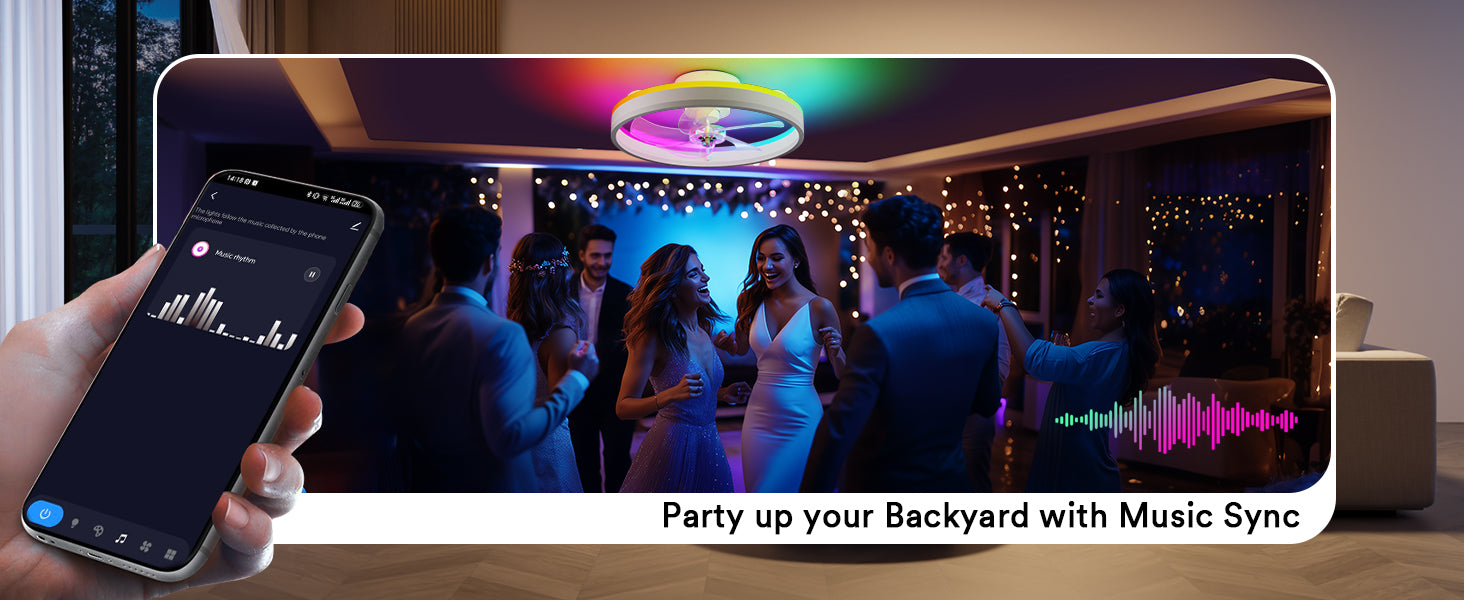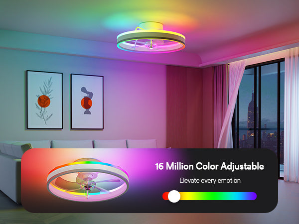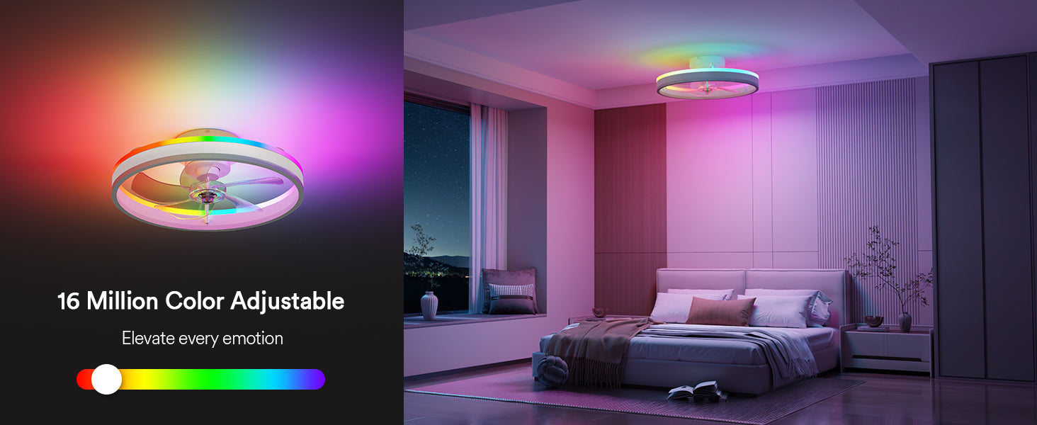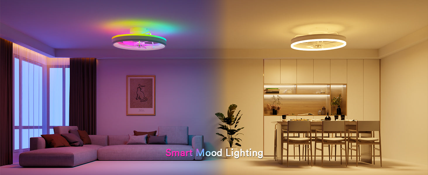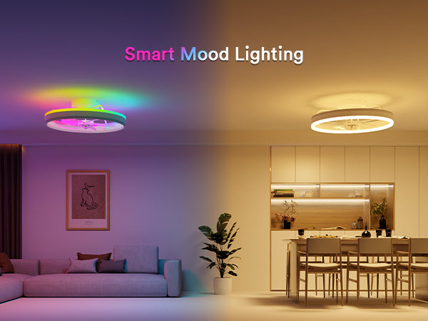 Immersive Dual Lighting:Transform your space with the Lumary smart ceiling fan, featuring 16 million RGBAI colors and a powerful CCT LED light with up to 5000 lumens brightness—as bright as three 100W incandescent bulbs. Adjust the brightness (0-100%) and switch between warm 2700K and cool 6500K to set the perfect mood for any occasion, whether it's a cozy night, a productive workday, or a lively gathering.