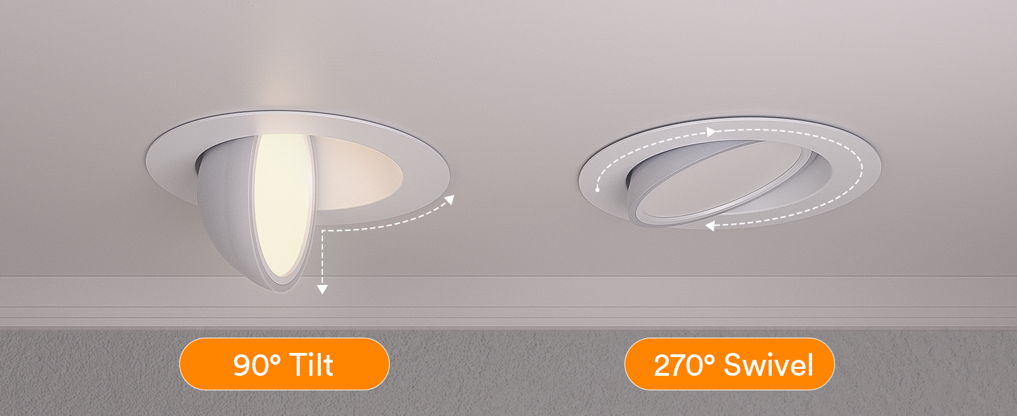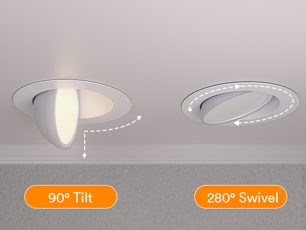 270° + 90° Adjustment: The Lumary 4-Inch Gimbal LED Recessed Light rotates 270° and tilts 90°, making it ideal for highlighting art, galleries, collections, and tricky spots like vaulted or sloped ceilings.
