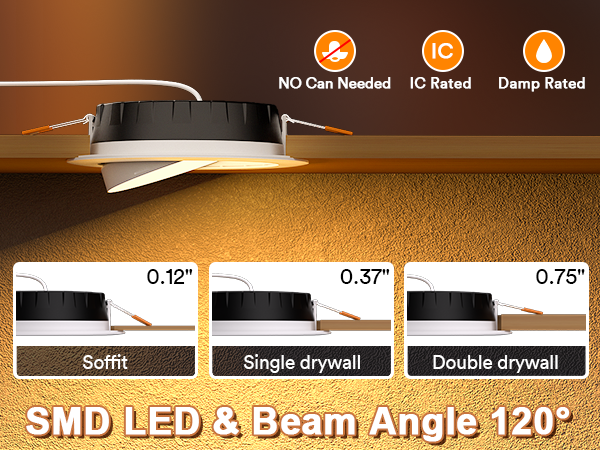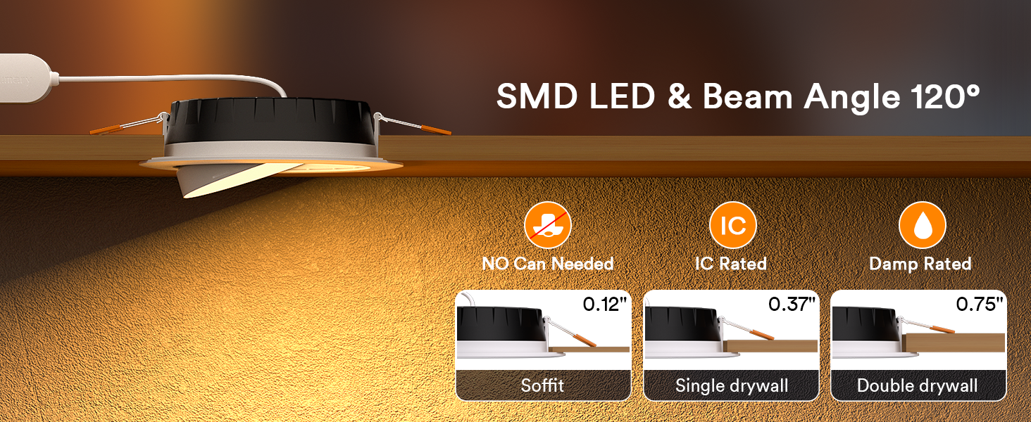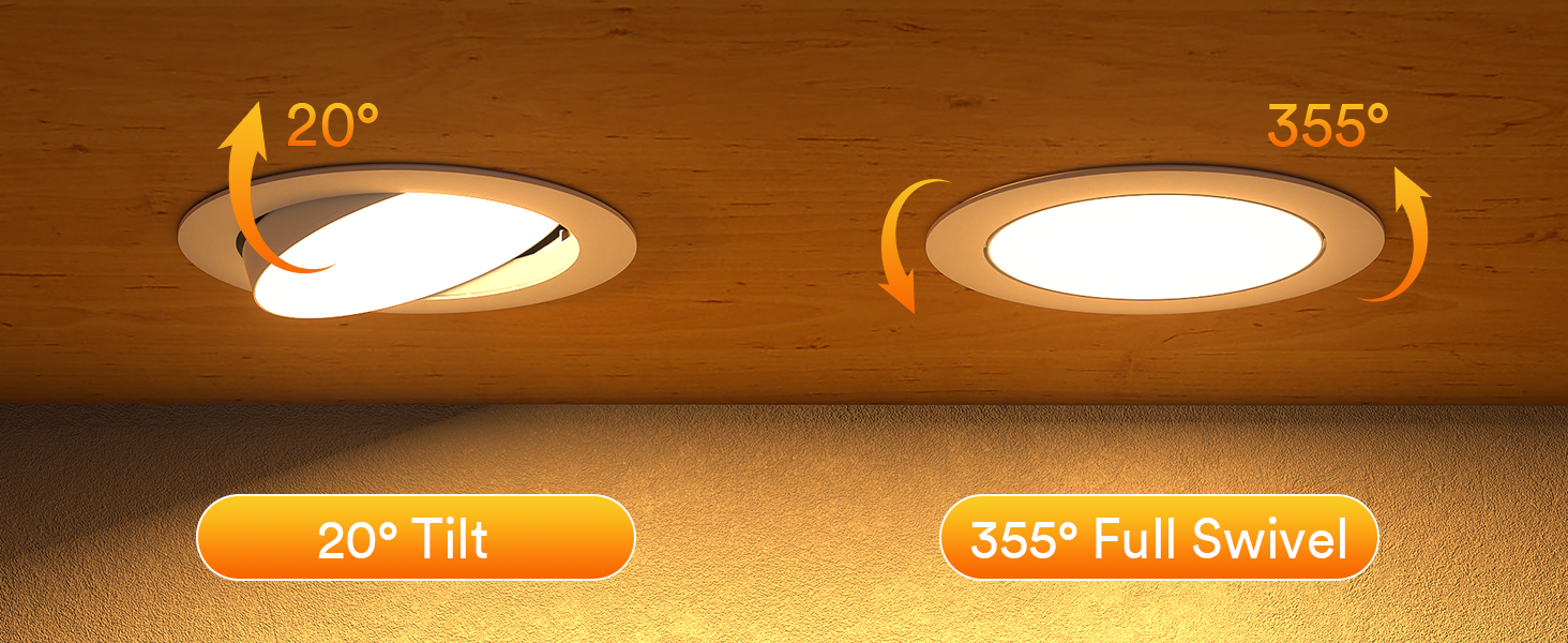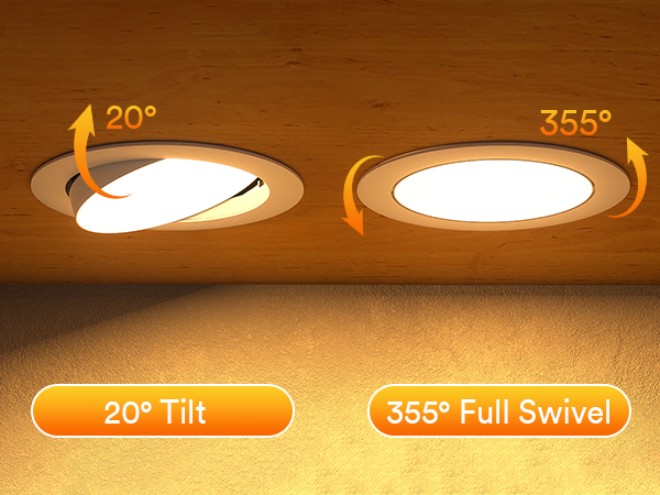 355° + 20° Adjustable: Rotate 355° and tilt 20° for precise lighting. Perfect for spotlighting and tricky spots like vaulted ceilings. Dimming from 1-100% for any ambiance.