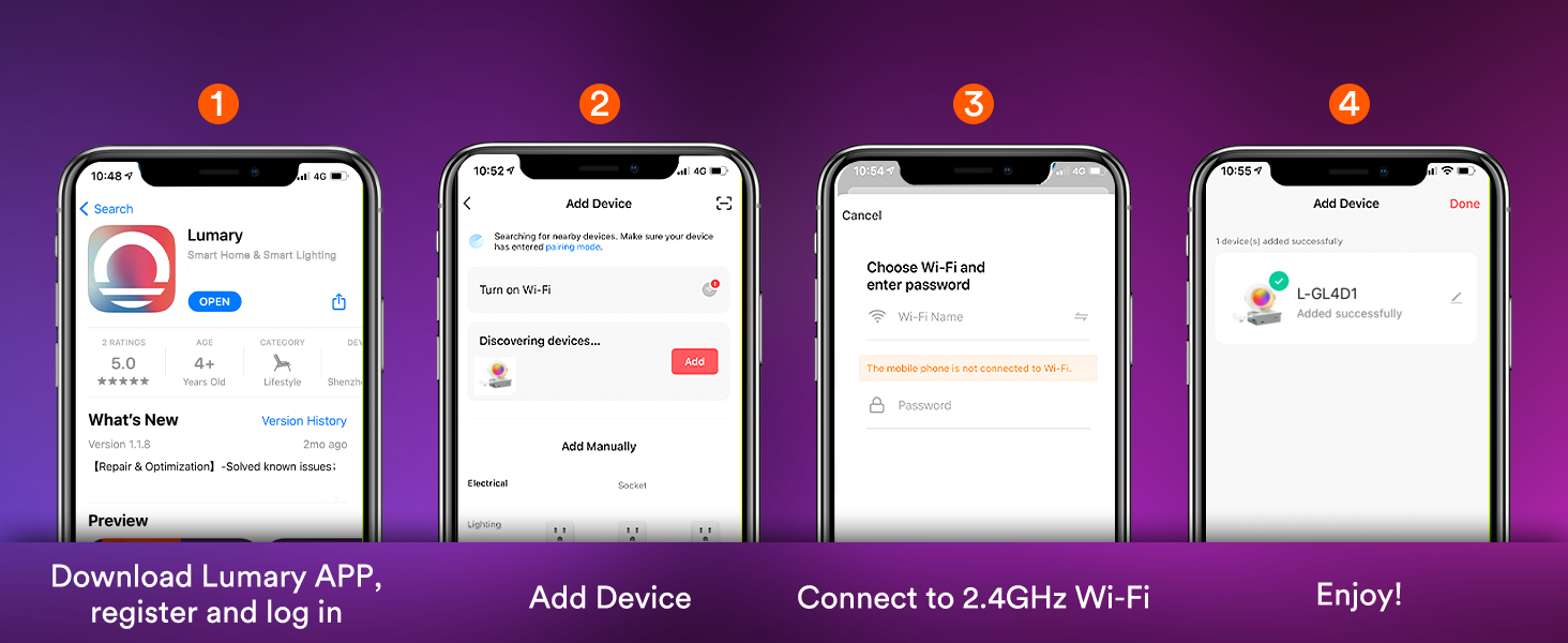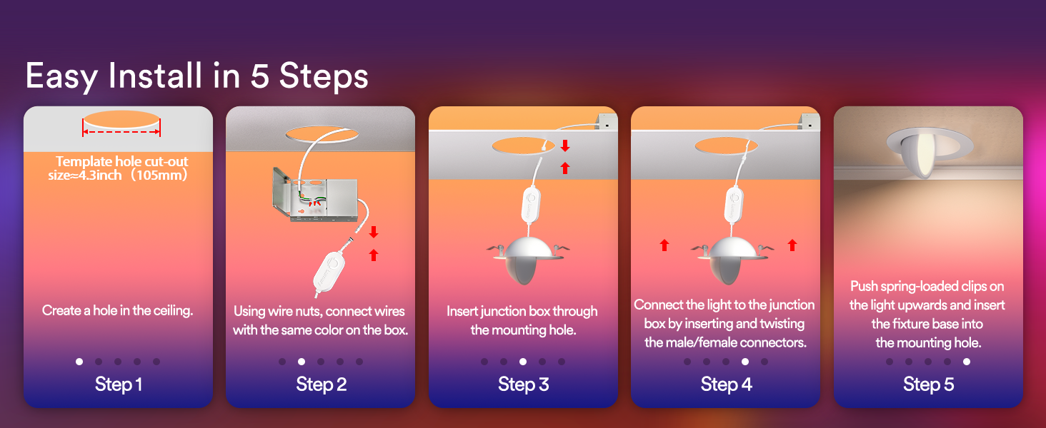 Voice/App Control: Works with Alexa, Google Assistant, and the Lumary app to easily adjust settings like colors, brightness, scenes, and timers. (Note: Only supports 2.4GHz Wi-Fi, and isn’t compatible with dimmer switches.)