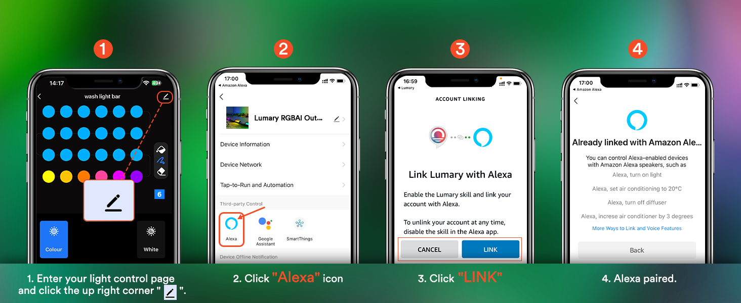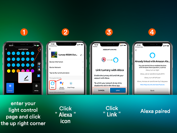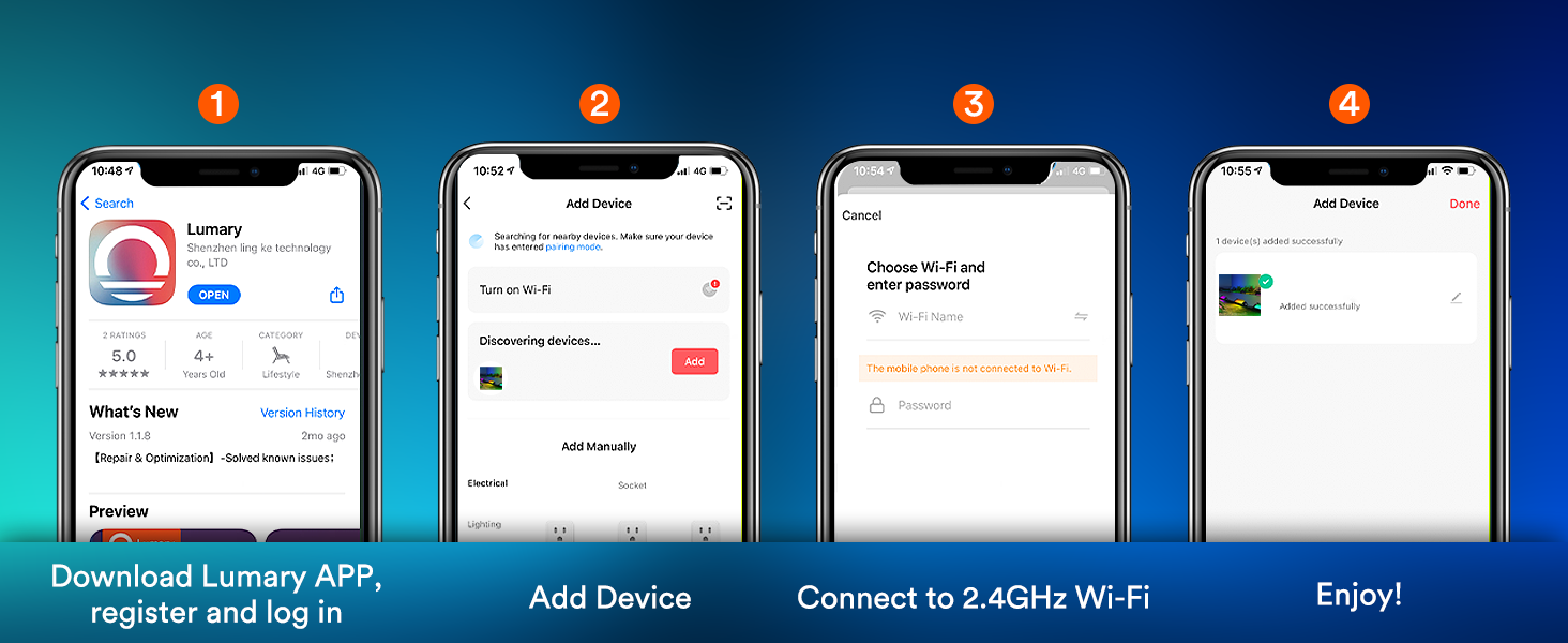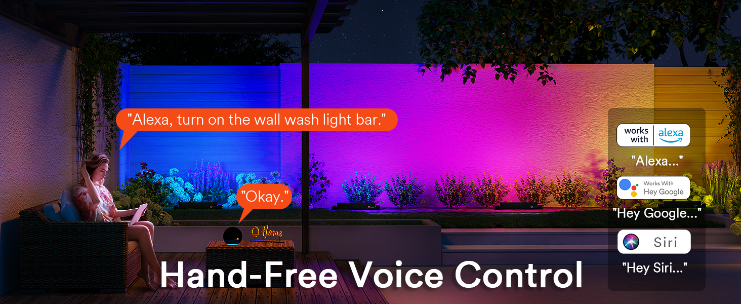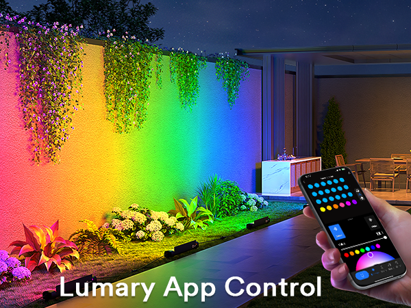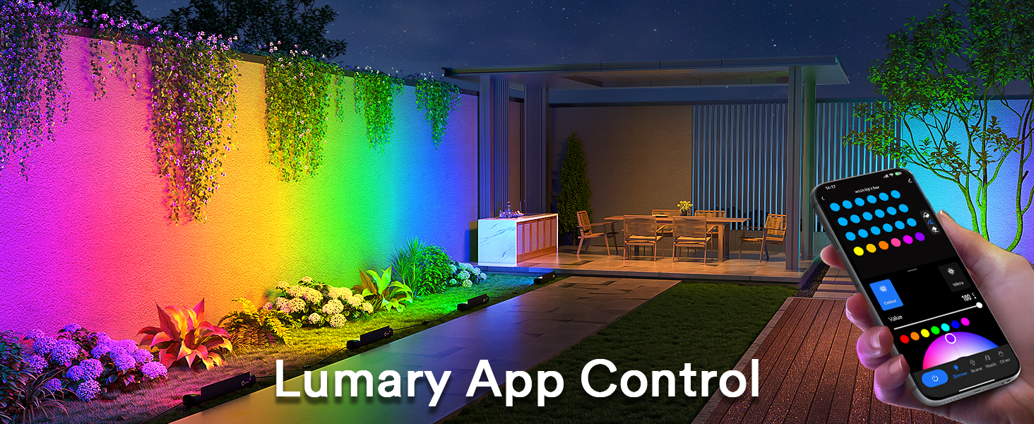 Multiple Control Methods: Control via Lumary app (2.4G Wi-Fi), voice (Alexa, Google Assistant, Siri), or control box. Adjust brightness, color temperature, and create scenes remotely.