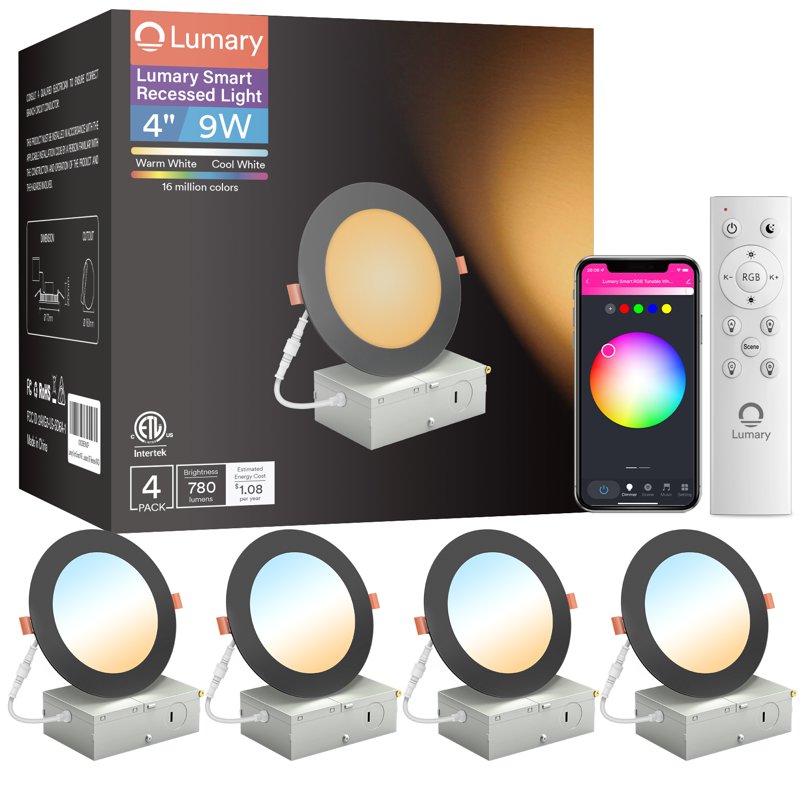 Lumary Smart Recessed Lighting Alexa Ultra-thin RGBW Color Changing Recessed Lights 9W 4 inch Black