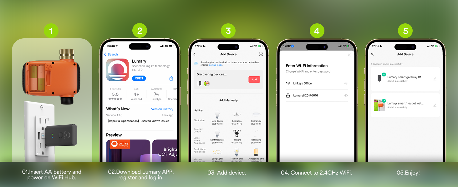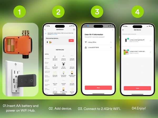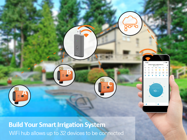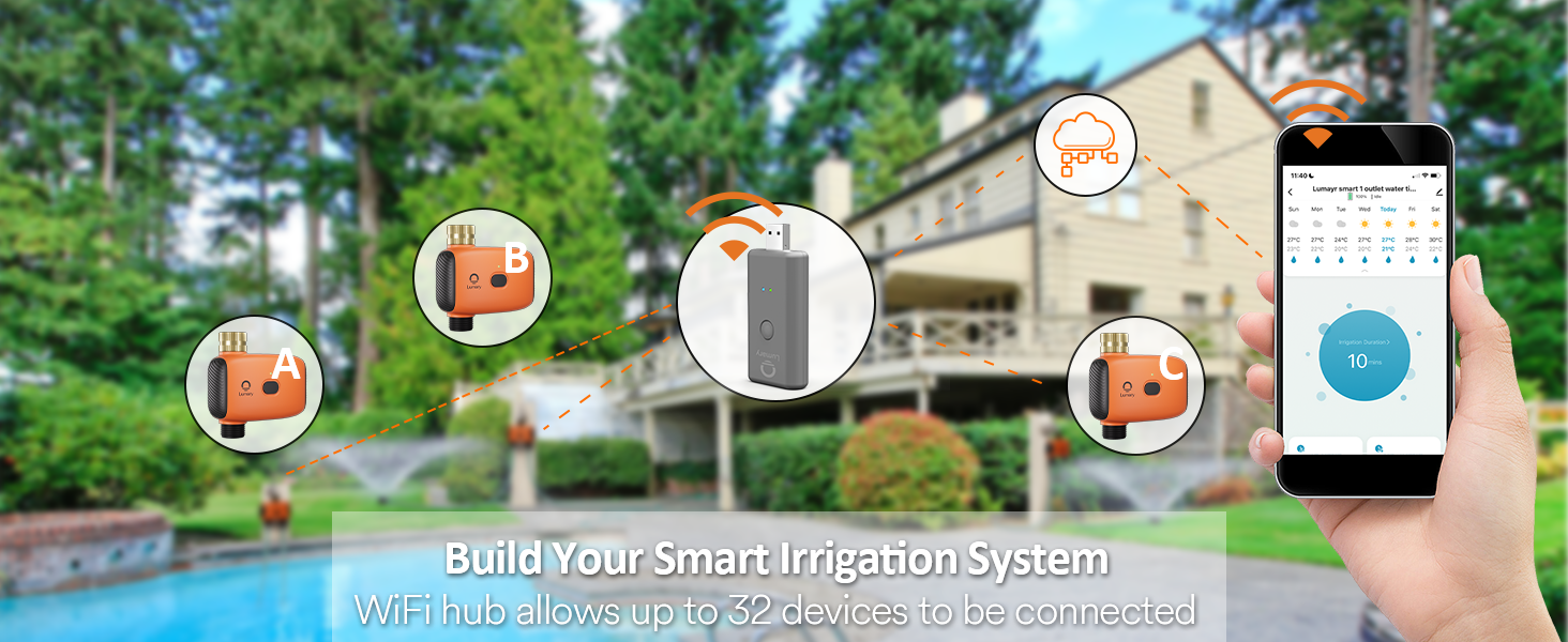 Easy Wireless Setup:Includes a WiFi hub that connects to your 2.4GHz network. Pair with your timer via the Lumary app to start managing watering remotely. One hub supports up to 32 timers within 50ft (or up to 165ft in open space).