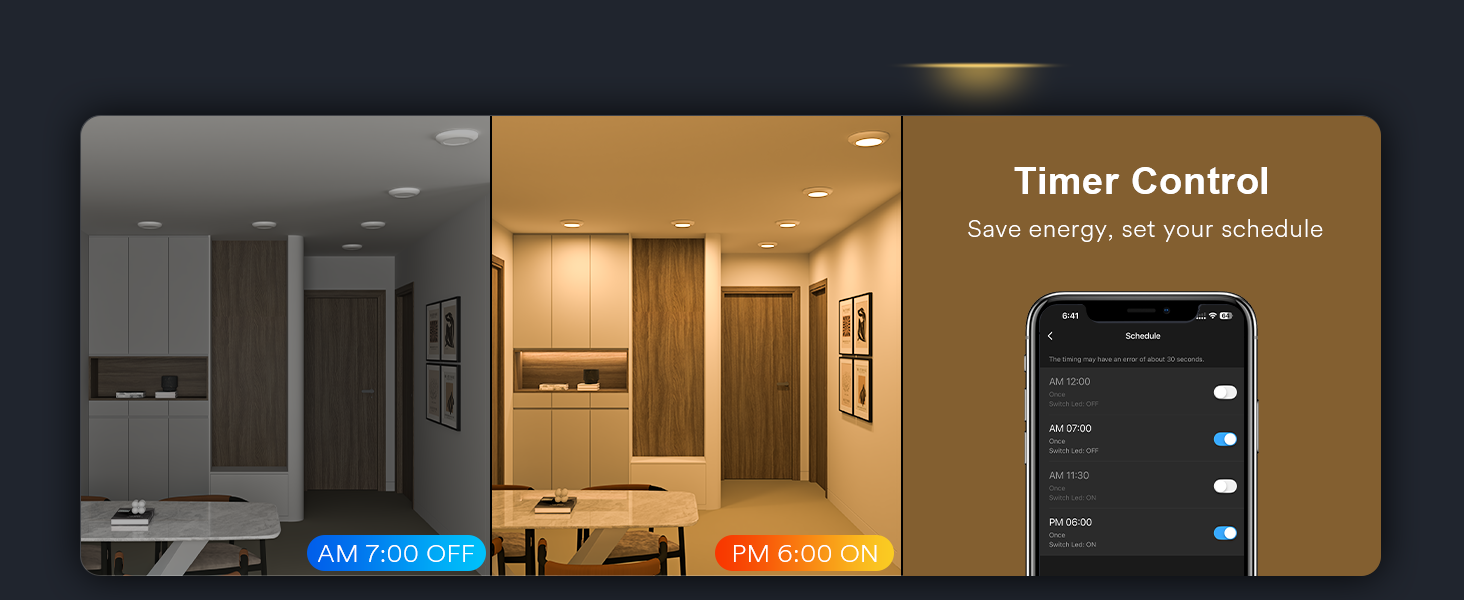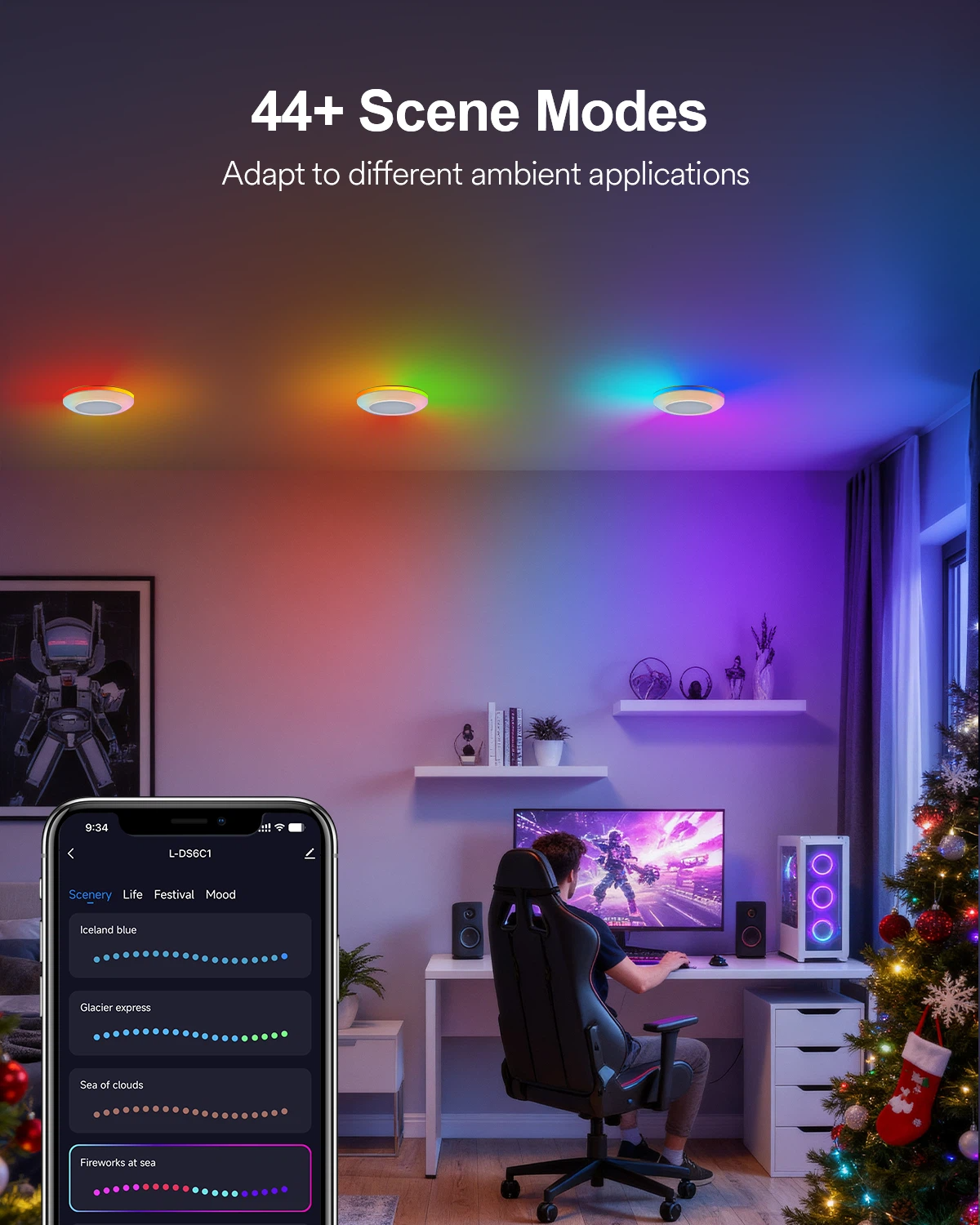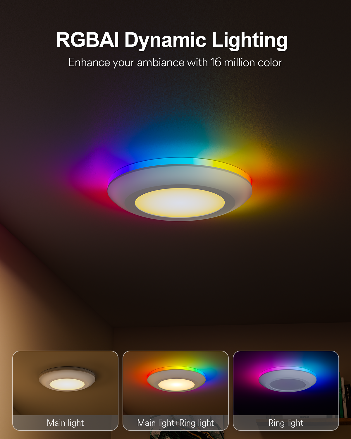 Scheduling & Automation: Set the RGBAI disc light to turn on or off automatically according to your daily routine. Schedule lighting times, create wake-up or sleep scenes, or sync with sunrise and sunset via the Lumary app for a convenient automated experience