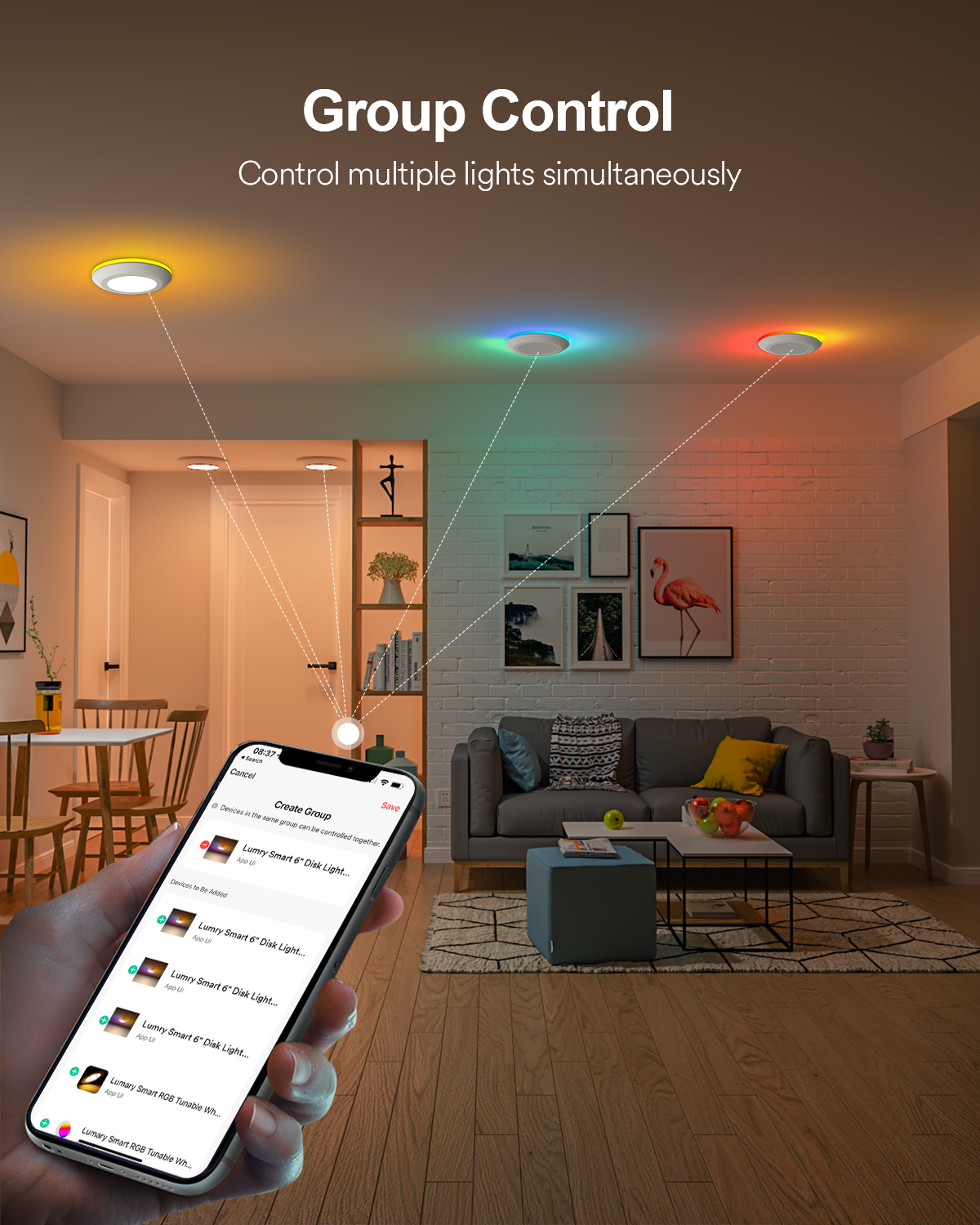Group Control & Device Sharing: You can create and manage groups of disk lights on Lumary APP. Allowing you to to control the lights in different areas simultaneously or individually and set different lighting modes for each room. You can aslo share the device to your family, enhancing convenience and personal comfort