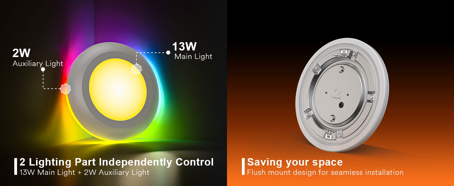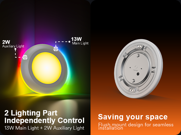 Adjustable CCT & Brightness: Lumary led recessed light flush mount offers a main light with 2700-6500K CCT, adjustable brightness from 1%-100%. The main light and RGBAI auxiliary light can work simultaneously or independently for flexible dual control. This versatile setup lets you easily adjust the lighting mode to suit any activity, enhancing both comfort and productivity in your space