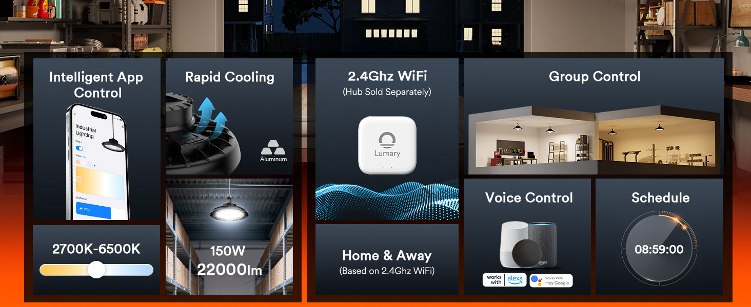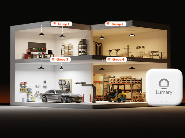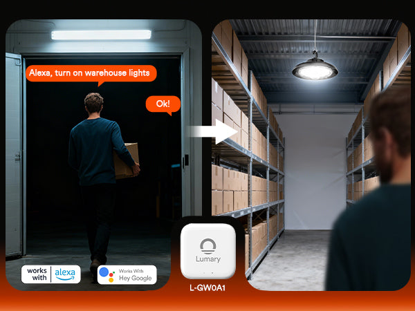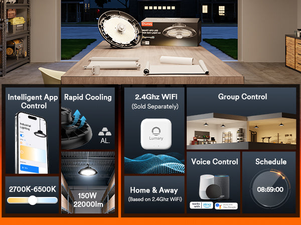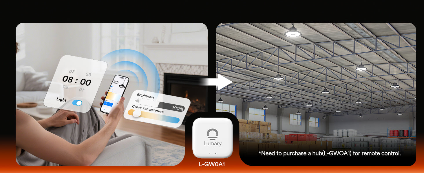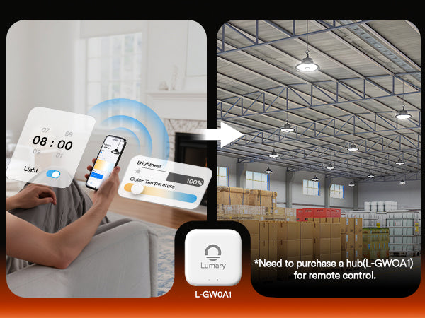 Unlock Smarter Functions: With Lumary hub L-GW0A1(sold saperately) in 2.4Ghz WiFi, Lumary UFO lights reach remote control, voice control, group control and automated work. Whether you're home or away for vacation, it can be controlled remotely or automatic operation through Lumary APP(Free APP). Enjoy the benifit of Alexa/Google Assitant. Manage shop, gym, warehouse, and logistics centers with ease. No longer worry about forgetting to turn off the lights. Seamless smart home with one tap on your phone