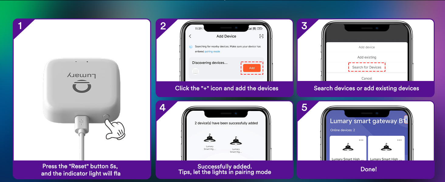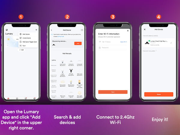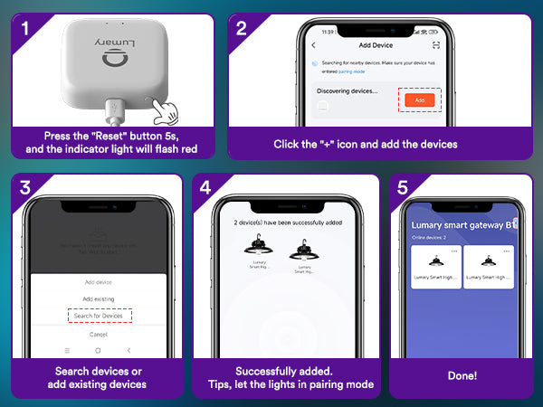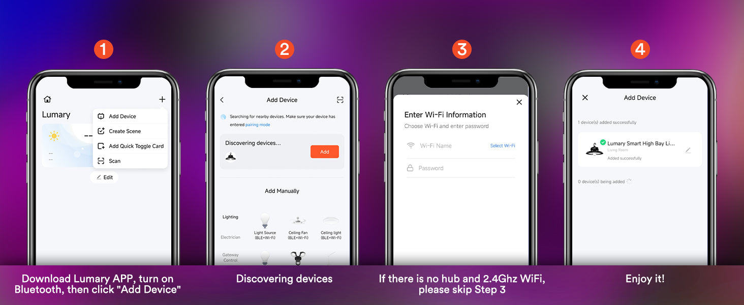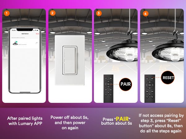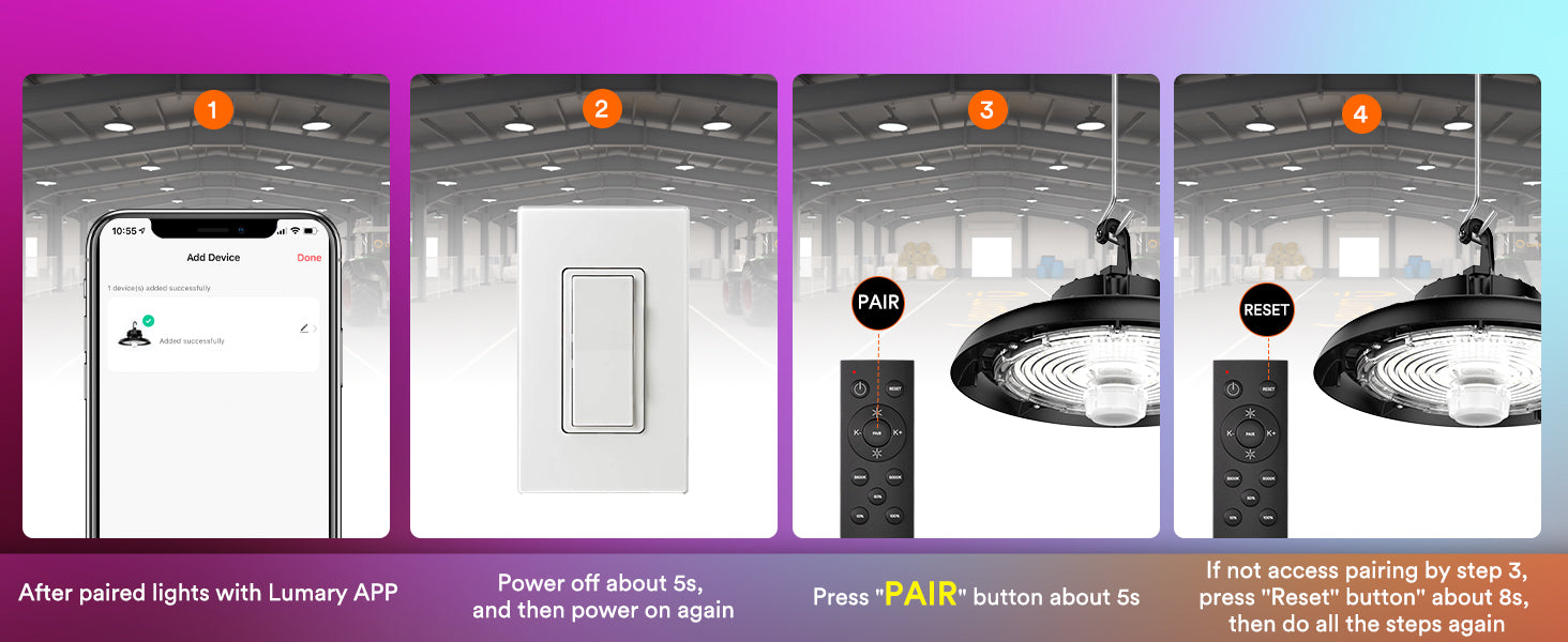 Unlock Smarter Functions: With Lumary hub L-GW0A1(sold saperately) in 2.4Ghz WiFi, Lumary UFO lights reach remote control, voice control, group control and automated work. Whether you're home or away for vacation, it can be controlled remotely or automatic operation through Lumary APP(Free APP). Enjoy the benifit of Alexa/Google Assitant. Manage shop, gym, warehouse, and logistics centers with ease. No longer worry about forgetting to turn off the lights. Seamless smart home with one tap on your phone