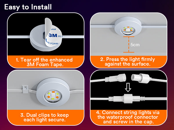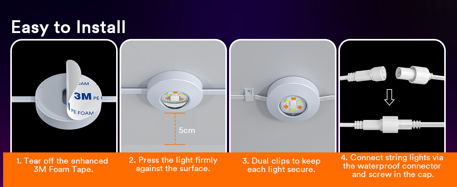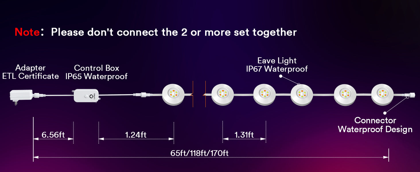 Note: Sets cannot be connected together. Each string segment has 20 LEDs, with a maximum of 3 extension cords and 1 string light extension per setup. For best wall-washing effects, install 2-3 inches from the wall.