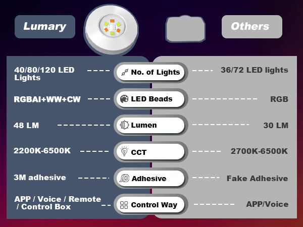 Multiple Control Methods: Control the lights via the Lumary App (2.4 GHz Wi-Fi only), voice commands, remote control, or control box, allowing flexibility for all users.